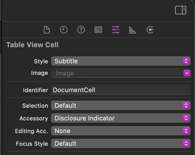 accessory à la celluleIl suffit de choisir l’accessory voulu depuis le Storyboard en sélectionnant la cellule et en choisissant l’accessory voulu dans l’inspecteur d’attributs.