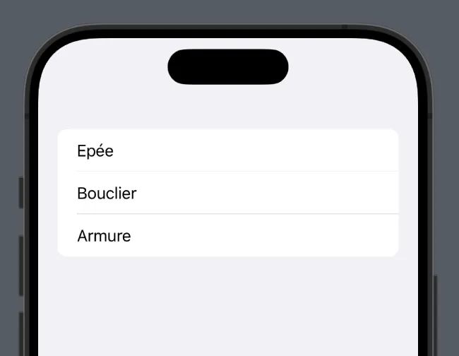 ContentView est votre vue principale. Elle adopte le protocole View.body est une propriété calculée qui retourne la structure de la vue que vous souhaitez afficher.Text("Hello, SwiftUI!") est une vue texte affichant le texte.Nous allons commencer par simplement lister une liste imaginaire et écrite en dur dans le code d’item.