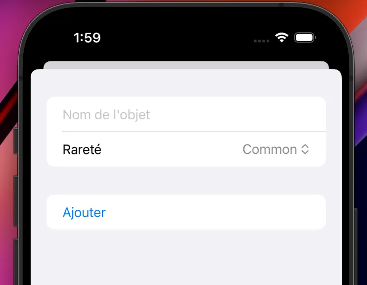 Rarity qui contiendra les valeurs suivantes : common, uncommon, rare, epic, legendary, unique, par défaut dans notre formulaire : common@State : name et rarity. Qui seront bindé aux champs du formulaire.🛟 Reprenez vos exercices Swift sur les enums pour vous aider.